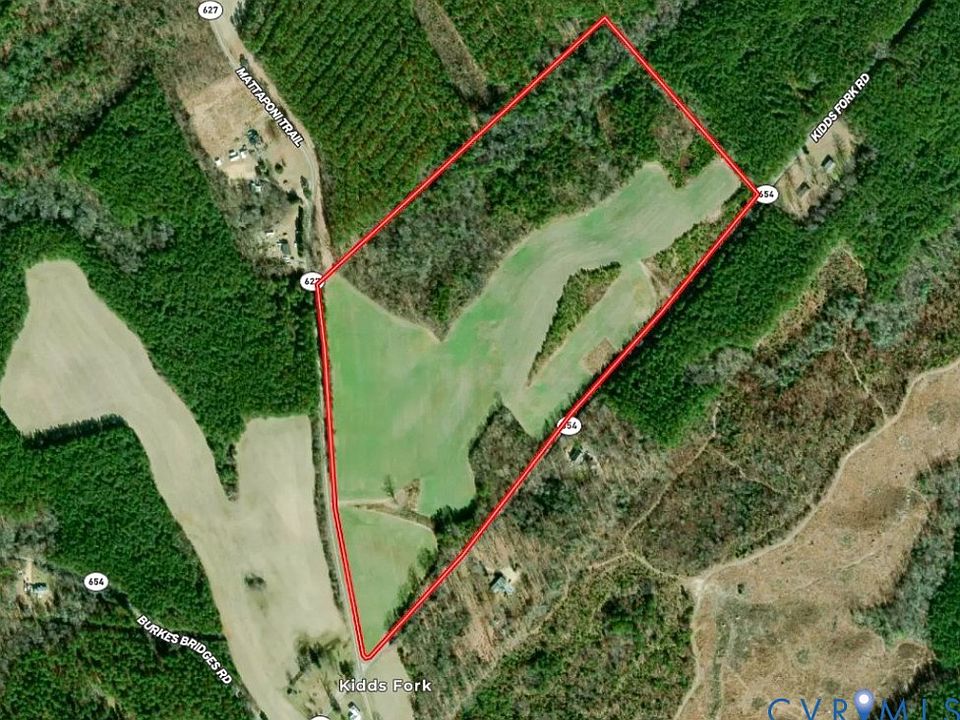 53.778 acres in Caroline County ideally suited for residential, agricultural, or investment use at the corner of Kidds Fork Road and Mattaponi Trail. Approximately half of the acreage is in productive cropland, with the balance consisting of mixed timber, hedgerows, and natural buffers. The property offers over 1,500 feet of frontage on Mattaponi Trail and over 2,400 feet on Kidds Fork Road, providing multiple options for driveway access or potential subdivision (buyer to verify with Caroline County).