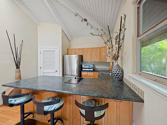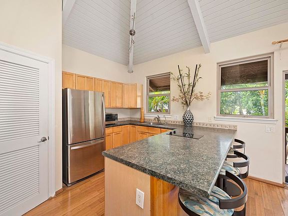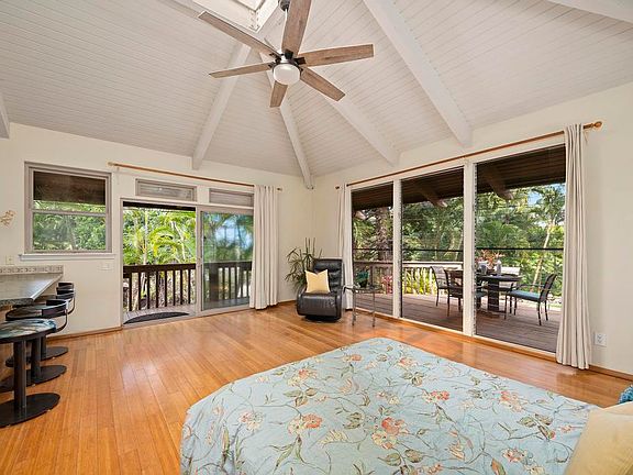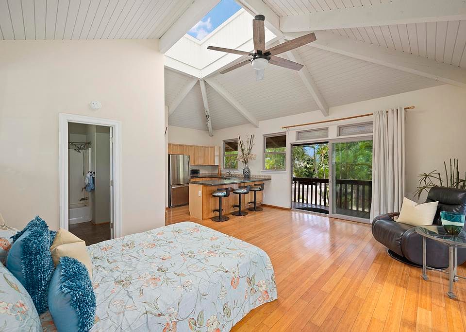 This open and airy studio, a detached 500 sq ft ohana located in desirable Maui Meadows, offers a comfortable and modern living space. The unit features vaulted beamed ceilings, a skylight, and large windows that fill the space with natural light and provide excellent ventilation. Step out of the sliding doors onto a large wrap around deck with an outdoor dining table.