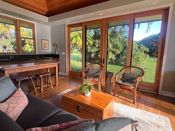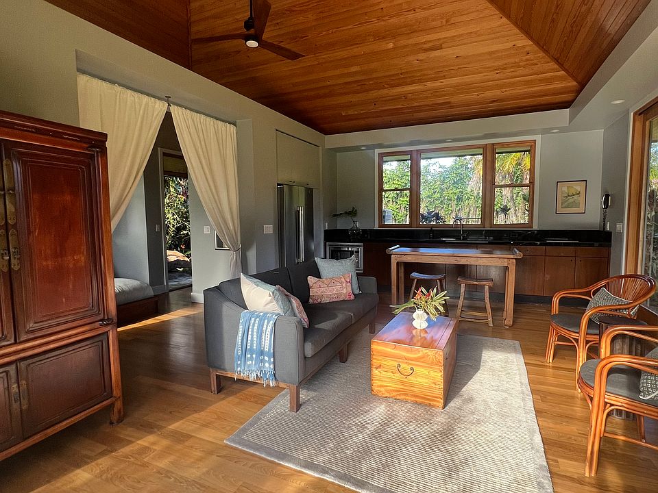 This standalone 499-square foot studio comes fully furnished with utilities, gas/electric/water/garbage/internet and landscaping included. The unit offers vaulted ceilings and new hardwood floors, large glass sliding doors and windows providing cool breezes and natural light, outdoor patio space, built-in storage, queen size bed, private outdoor lava rock shower, full size refrigerator, electric countertop double burner, microwave, and private laundry located outside the studio. The property includes mature mango, avocado, lemon, banana trees and more. Note, there is no oven, dishwasher or AC.