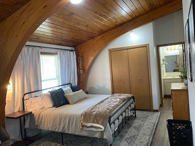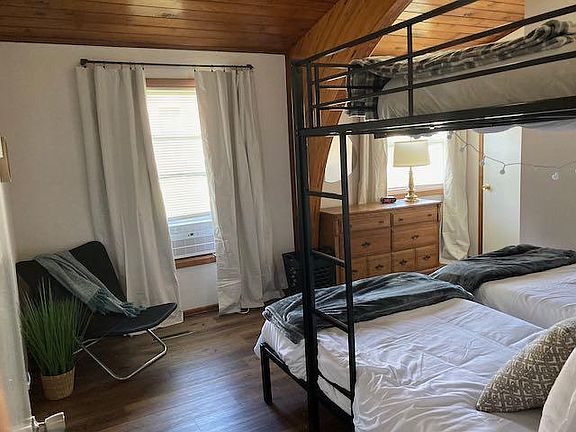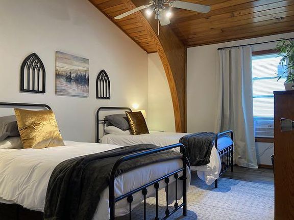 Furnished house; all one level half-duplex that was converted from a church building! The vaulted cathedral ceilings make it feel much larger than 1800 square feet. Extra large kitchen and dining space, separate living space with Amazon Fire TV, fast wifi, and 3 spacious bedrooms. The back deck has propane grill and plenty of off-street parking. King bed master with ensuite bathroom. In home laundry. Can combine with other half if available, for a 5 bed/3bath double home (see Whole Double home listing). All utilities and wifi included in rent price! Pet rent $50/ month per pet.
