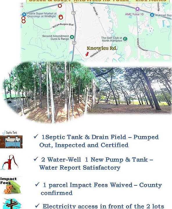 Improved 2.01 Acres Land Near City Amenities & Amelia Island Resort Paradise! 85094 and 85102 Knowles Rd. Yulee FL 2 PARCELS -1 ACRE EACH) Access via private easement with compacted rock surface Fully Brush-Cleared and ready for you. Sold AS- IS: - 1 SEPTIC TANK on site. recently located - 2 Fully Operational Water-WELLS, - 1 Commercial Filtration System - 3 Wood Poles, - 1 New Electrical Box, and Electricity is accessible at the front of the property. - 1 Water Well Report - Surveys available upon request for Qualified Buyers Located just minutes from top-rated schools, shopping centers, Amelia Island beaches, and the airport. A prime opportunity to build or invest in a growing area!