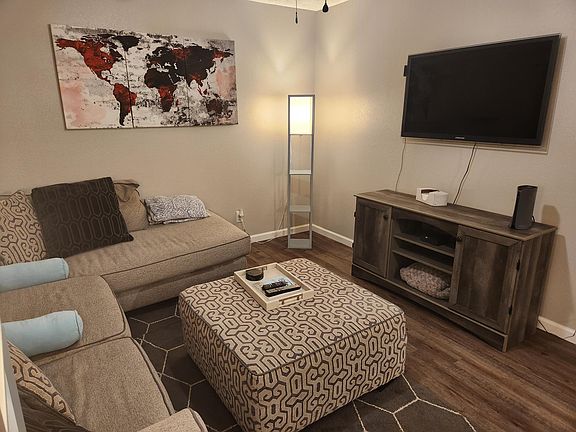 Fenced yardQueen bedKing bedOpen floor planLots of storageFull size appliancesLarge sectional couch