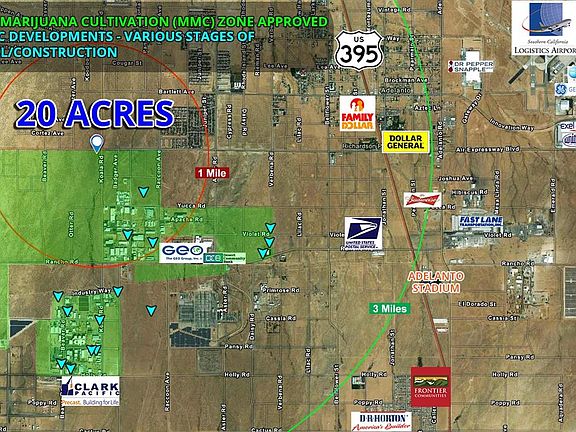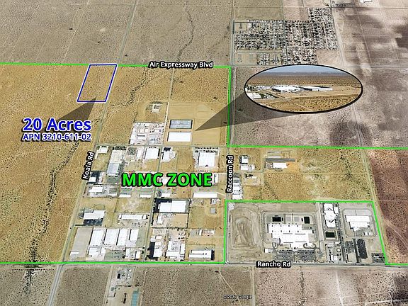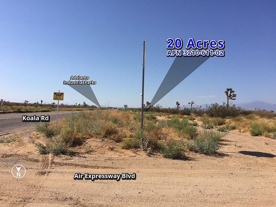 20 Acres vacant land at the southwest corner of Koala Rd (paved) and Air Expressway (graded). Manufacturing Industrial zoning with Medical Marijuana Cultivation Permitted. Sewer & Water are approx. 1,320 Feet from Site (buyer verify all utilities). Near by, there are numerous facilities being retrofitted to better serve MMC tenants, and multiple new construction projects being raised to accommodate the influx of businesses permitted in the zone.