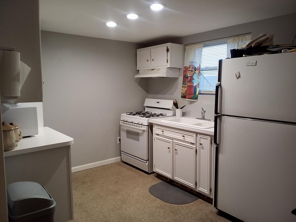 Lower level 2 bedroom, 1 bath, apartment with open floor plan. Kitchen features white cabinets, stove, microwave, and refrigerator. Spacious living area, two large bedrooms, laundry room, and bathroom. New vinyl plank flooring throughout. Ceiling fans throughout. Sliding glass doors to large deck and private driveway.