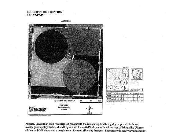 Wheat & Corn. Family owned since 1930. Farmers in place for 30+ years. Property is a section with a well and a double pivot. 240 acres wet. The rest is dryland. Soils are good Richfield & Ulysses silt loams 0-1% slopes w/few acres fair quality Ulysses silt loams. 1-3% slopes with a few small Pleasant silty clay lagoons. Topography is nearly level to gentle sloping. Seller rates the well @ 350gpm. Tenant owns double pivot. Water rights allows 520 ac. ft. at 600gpm. with a pump rate of 315gpm. Land is located about 4 miles North and 1 mile west with county Rd. access.