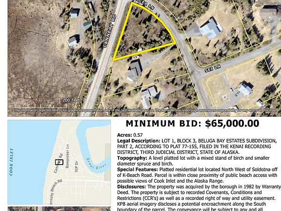 AUCTION!!! Government land in Kenai Peninsula Borough - Seller Financing available. 28 properties for sale. Bid online from anywhere in the world or in-person at the Soldotna High School at 10am on Sat, May 11; all bidders must register with Alaska Premier Auctions & Appraisals LLC. Online registration open now; in-person at 9am on auction day. Buyer to verify all info.