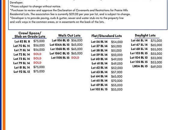 Capture the Lifestyle at Prairie Hills and the convenience to Brookings newest school. These residential building lots offer open, common areas with extended views and the amenities of a Master Planned Development. See photos & documents for more available lots & pricing. AGENTS: Please see attached documents for the covenants, fencing, shed & outdoor play structure guidelines, lot map, general plan of development & location of standard, daylight, crawl space/slab on grade & walk-out lots. Prices subject to change. Jacob Mills is a member of Prairie Hills LLC and is a licensed SD real estate broker. Agents-There is a special Purchase Agreement for Prairie Hills Residential Lots, see documents. Association fee is currently $211.00/year. Subject to change.