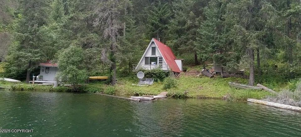 This fully insulated and well-cared-for cabin w/excellent SW exposure and flat access, plus a dock from the lake, includes a guest cabin & tool shed. Property comes with necessities for off-grid living - 3,600-watt generator, solar panel and wind turbine system, and battery bank. Cabin has a full bath, loft, hot water on demand, wood-fire cook stove, and propane oven, refrigerator, freezer, more!
