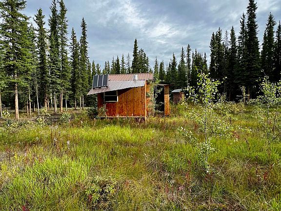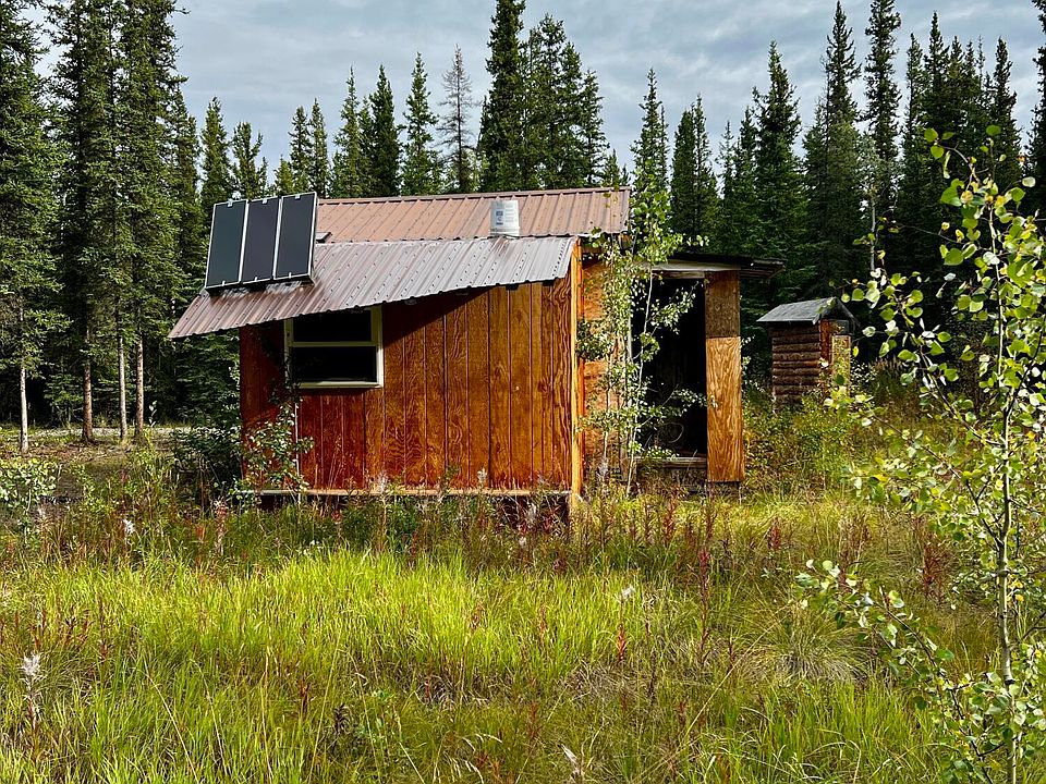1.262-acre lot featuring a small cabin, mobile trailer, and outhouse. Power is nearby, located across the street and one lot over.