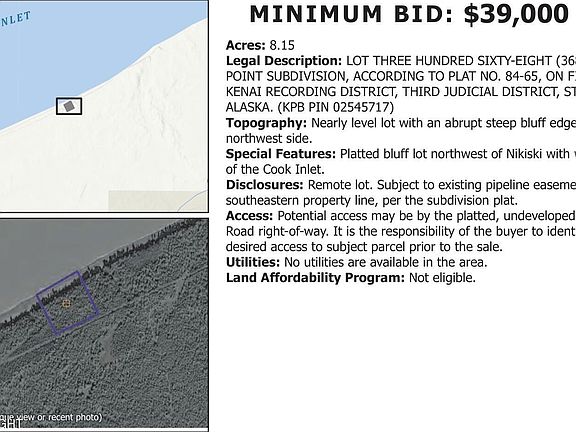 AUCTION! 11 Kenai Peninsula Borough-owned lots! Seller Financing Available. Online-Only Auction, ends Oct 15 @ 6pm AKT. Pre-register to participate online. Bidders register with Alaska Premier Auctions & Appraisals LLC. Sale price may be higher than the list price.