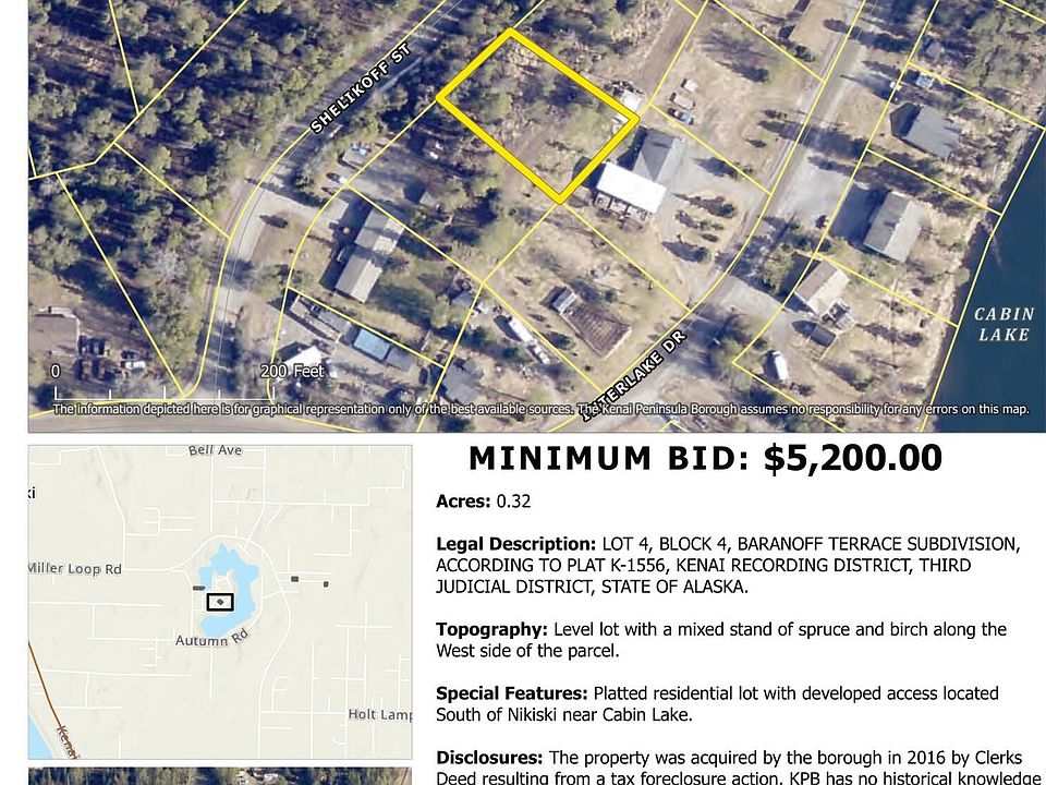 AUCTION!!! Government land in Kenai Peninsula Borough - Seller Financing available. 28 properties for sale. Bid online from anywhere in the world or in-person at the Soldotna High School at 10am on Sat, May 11; all bidders must register with Alaska Premier Auctions & Appraisals LLC. Online registration open now; in-person at 9am on auction day.