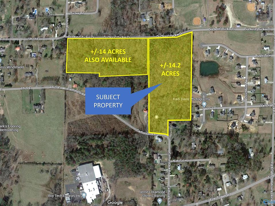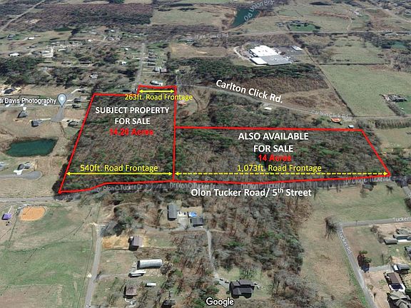 14.2 acres for sale in Grant, AL in a residential area. Adjacent 14 acres also for sale. See image for details. Road frontage on Carlton Click Road is 263ft. and road frontage on Olon Tucker Rd is 540ft. with the potential of 1,600ft. of frontage if adjacent property is included in the purchase. See image for details.