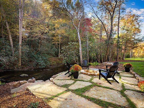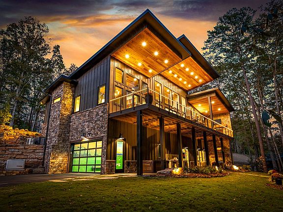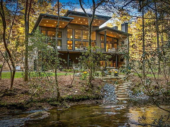 The Onyx Lodge at Fightingtown sets the tone for North Georgia's newest luxury creekfront community—bold architecture, exceptional craftsmanship, and an irreplaceable setting. Positioned on 3.4 private acres with 420+ feet of premier Fightingtown Creek frontage, this modern lodge offers 5,400 sqft of refined mountain living with 4 bedrooms + a 12-person bunk suite, 5 full bathrooms, and a half bath. Walls of glass capture the surrounding beauty—from the rushing creek below to the wooded backdrop. High-end finishes are showcased throughout: dramatic porcelain tile bathrooms, a freestanding stainless soaking tub in the primary suite, secret doors, custom closets, warm wood details, and sophisticated lighting and moody paint selections that elevate each room's atmosphere. Designed for effortless hosting and unforgettable retreats, the home features four fireplaces, two full kitchens, an outdoor kitchen, and a game room/lounge. The lounge evokes a private club feel with a pool table, bar, multiple TVs and opens up directly to a fire-pit, hot tub, stone steps leading you to the water's edge, and golf simulator in the garage. Expansive Trex decking and covered outdoor spaces maximize year-round enjoyment of the creek's sound and scenery. Luxury. Privacy. Creekfront living at its finest. The first—and a true flagship—of this exclusive new development.