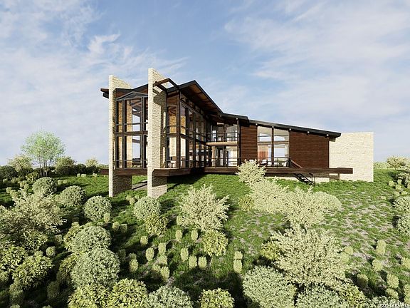 Architectural brilliance, elevated design, and unforgettable views! This to-be-built custom luxury residence is thoughtfully planned for 3+ acres of sweeping Texas Hill Country scenery in Helotes, just **13 miles from San Antonio. Introducing the Taliesin 2840, a refined fusion of timeless elegance and modern sophistication, inspired by the enduring design philosophy of Frank Lloyd Wright. Originally conceived by Frank Henry, a distinguished architect and former instructor at the Frank Lloyd Wright School of Architecture, this exceptional home is now being meticulously brought to life by Lindal Homes and the Texas Lindal representative, Hill Country Cedar Homes, under the guidance of Aris Georges of OM Studio Design-an esteemed graduate and past instructor at the school. Designed to make a statement while remaining beautifully in harmony with the landscape, the Taliesin 2840 is elevated on solid masonry piers, giving the home a light, floating presence above the terrain. A dramatic butterfly roofline crowns the structure, creating architectural poetry and an unmistakable silhouette against the Hill Country sky. Inside, a breathtaking two-story living room anchors the home and flows seamlessly into an open dining and kitchen environment, highlighted by a striking floor-to-ceiling, see-through fireplace. Expansive walls of glass invite the outdoors in-flooding the interiors with natural light and framing panoramic views from nearly every vantage point. A sculptural floating staircase leads to a second-floor loft/studio, while exposed "scissor" roof beams add warmth, volume, and architectural drama throughout. Offering 3 bedrooms, 2.5 baths, two fireplaces, two private offices, a versatile loft/studio, and a detached 2-car garage, this residence balances luxury, functionality, and serenity. Crafted with Lindal's renowned materials and precision, the Taliesin 2840 is more than a home-it is a legacy-quality work of art, designed to inspire for generations. Ready to be built, this extraordinary plan blends a refined, mountain-inspired aesthetic with clean modern lines-ideal for capturing big-sky views and showcasing a dramatic wall of windows overlooking the stunning Texas Hill Country.