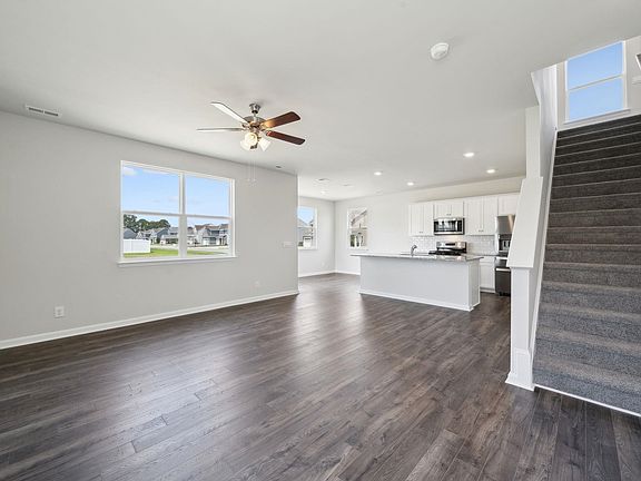 Welcome to The Pine, a stunning 1,953 sq ft open-concept home that perfectly blends comfort and functionality. This beautifully designed home features four spacious bedrooms, two and a half bathrooms, and a two-car garage, offering ample space for your family to grow and thrive. As you enter, you'll be greeted by a welcoming foyer with a convenient powder room and coat closet. The open floor plan allows for seamless flow between the living room, casual dining area, and kitchen, creating the ideal space for family gatherings and entertaining. The spacious kitchen is a highlight, with a large island offering plenty of seating, an impressive corner pantry, and stainless steel appliances. It overlooks the living and dining areas, and a sliding glass door provides easy access to the backyard. Upstairs, the owner's suite offers a private bath with a double bowl vanity and two oversized walk-in closets, creating a luxurious retreat. The three additional bedrooms are generously sized, providing ample privacy, and share access to the second full bathroom. The laundry room is conveniently located on the second floor, along with an extra hallway closet that could serve as additional storage or a linen closet.