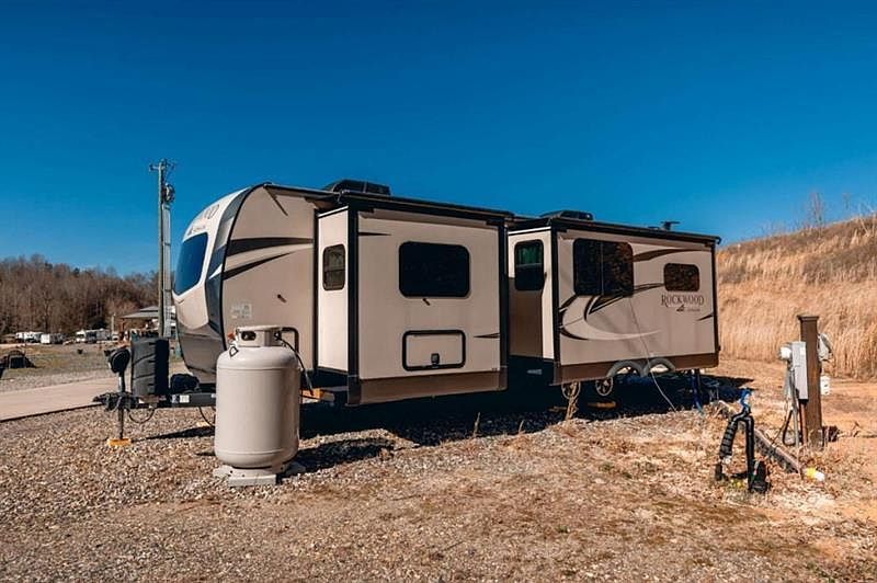 Come and experience this amazing RV/Tiny home community in Blue Ridge, Georgia! This lot is even being offered with a 2021 Forest River Rockwood Lite 2 Travel Trailer! This camper is complete with furnished large bedroom, living room with electric fireplace, kitchen and dining area, and bathroom with shower and even laundry area with washer and dryer. It has a brand new deck and never used fire pit as well. Waterside of Blue Ridge has an abundance of amenities including swimming pool, basketball court, playground, creek, pavilions and a great STR investment.