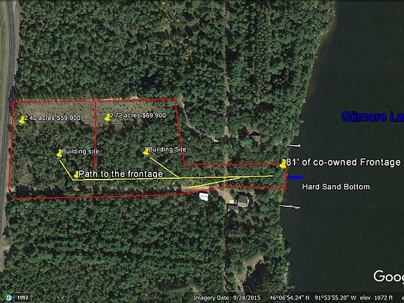 Northwest Wisconsin lakefront property for sale with 2.72 acres of mature oaks and pines and an ideal camping/building site ready for your log home plans! Walk along the trail from your property to 81' of sand beach shore and boat dock on Gilmore Lake and boat, fish, swim and play on nearly 400 acres of 36' deep clear, clean waters. Enjoy seasonal camping on your secluded property until you build your cabin in the woods just off a paved road with power available on this Washburn County real estate. A true Northwood's Wisconsin lake, Gilmore Lake is surrounded by tall pines and quiet seclusion!