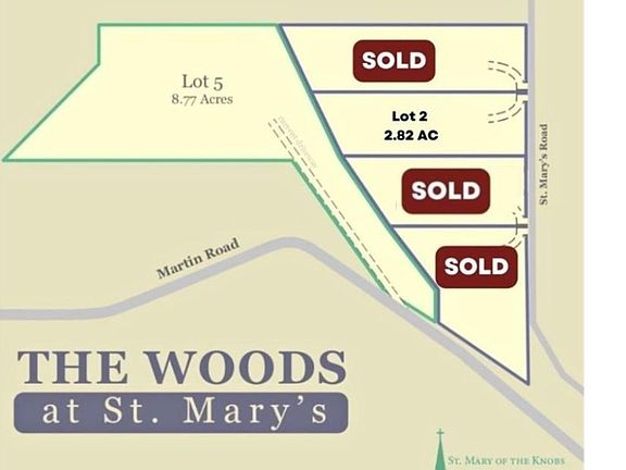 Don't miss this rare opportunity to own 2.82 wooded acres with scenic views in the established subdivision of The Woods at St. Mary's. Only two lots left! A peaceful creek runs through the property, adding natural beauty and charm. Build your dream home in the heart of Floyds Knobs with the convenience of a gravel driveway already installed. Utilities available include water (Borden Tri-County), electric (REMC), and high-speed internet (Spectrum). The property is approved for a septic system to serve up to a four bedroom home, with two additional potential system locations staked on site. A minimum 1,800 sq. ft. build requirement applies. Conveniently located just minutes from I-64 and Louisville, within Floyd County Schools.