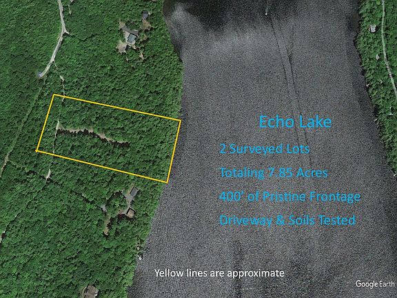 Two building lots on Echo Lake with 7.9 acres and 400 feet of deep frontage with spectacular open views across the lake. Property on this lake is sought after and Echo is known for its above average water quality, the property is wooded and level to the lake, has a driveway already installed, surveyed and ready for building plans. Fish for salmon, bass and trout in this deep lake of 117 feet, explore all 1109 acres and 14.5 miles of shoreline and enjoy the quiet serenity of one of the premier lakes in Central Maine. Build two or more homes or multiple cabins with this very rare opportunity.