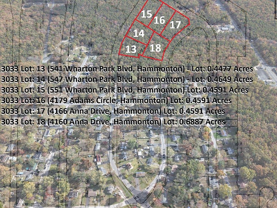 This is a listing for 6 lots, Here are the details: Block: 3033 Lot: 13 (541 Wharton Park Blvd, Hammonton) - Lot: 0.4477 Acres Block: 3033 Lot: 14 (547 Wharton Park Blvd, Hammonton) - Lot: 0.4649 Acres Block: 3033 Lot: 15 (551 Wharton Park Blvd, Hammonton) Lot: 0.4591 Acres Block: 3033 Lot: 16 (4179 Adams Circle, Hammonton) Lot: 0.4591 Acres Block: 3033 Lot: 17 (4166 Anna Drive, Hammonton) Lot: 0.4591 Acres Block: 3033 Lot: 18 (4160 Anna Drive, Hammonton) Lot: 0.6887 Acres