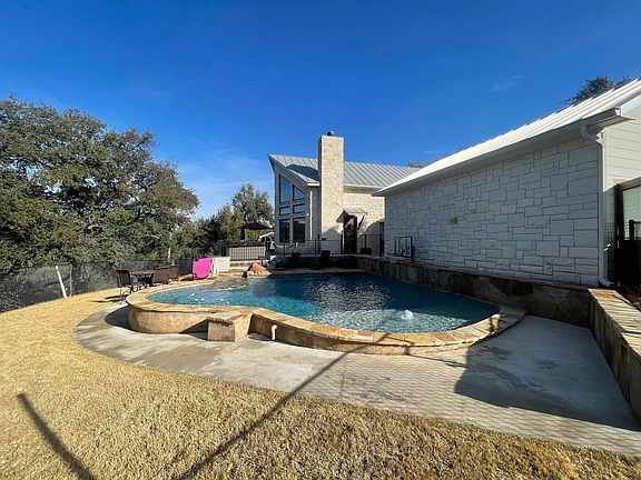 Welcome to Walk About Way, a 4 bedroom 3 bath, white rock jewel in the heart of the Texas Hill Country. Built in 2006, this possible income producing home is nestled on a little over 5 acres with plenty of mature oaks, a wet weather creek just below the pool, 2 car detached garage, private gated entry with easement access into Log Country Cove, a 24X48 barn with an open front, and much more. Inside the home you will find granite counter tops, stainless steel appliances, new Anderson Window package to allow for excellent Hill Country views from the Living room, stained concrete floors, etc. The Master Bedroom is located on the first floor with an in suite bath. Also on the first floor is an additional bedroom and bathroom. Upstairs feature an open loft, perfect for an office or additional sleeping, as well as two bedrooms with a shared bath. The home features its own well and septic system. HVAC downstairs replaced in 2021 and Water Heater replaced in 2022. Come see this custom home located in Log Country Cove near constant level Lake LBJ.