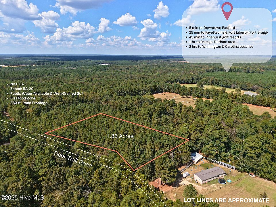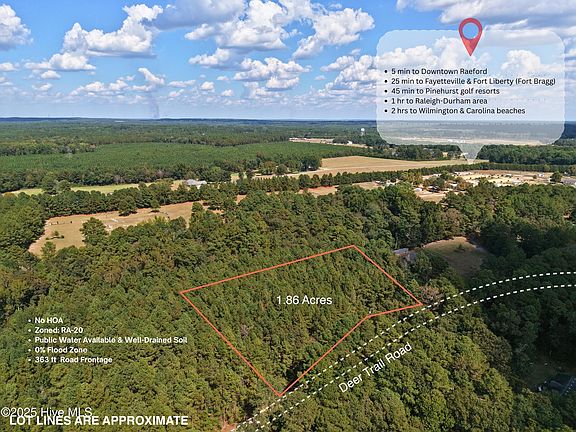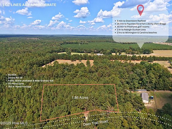 Beautiful homesite on Deer Trail in Raeford, NC featuring 363 feet of road frontage and access to public water. The parcel is well-drained with Baymeade fine sand soil (conventional septic ready), offering great topography — ideal for residential construction or a small hobby farm. Zoned RA-20, this property supports stick-built, modular, or manufactured homes. Enjoy quiet country living just 25 miles to Fayetteville, 30 miles to Southern Pines, and 85 miles to Raleigh. Not in a FEMA flood zone and no HOA restrictions. A rare combination of accessibility, privacy, and development potential.