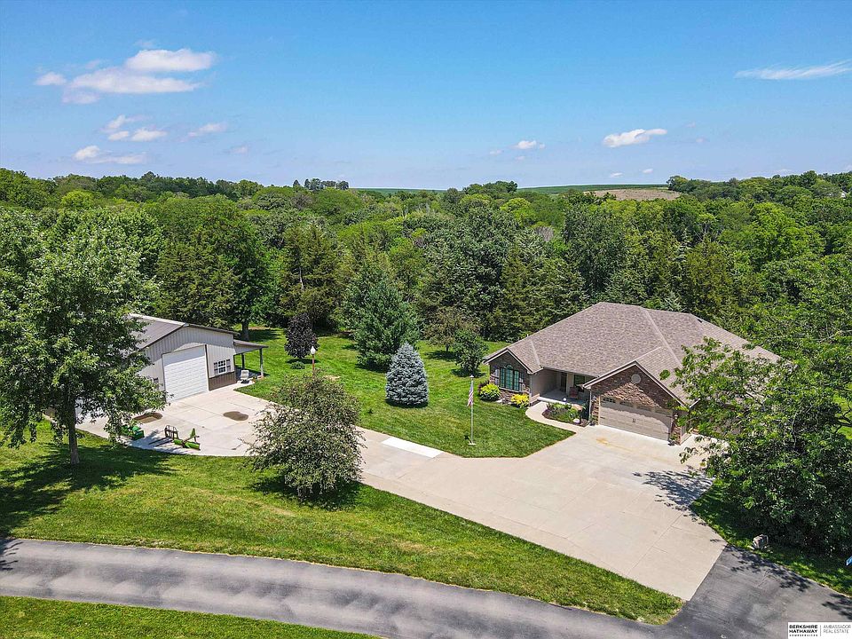 MORE THAN AN AMAZING! RANCH HOME.LAND + OUT BUILDING 9+ CAR garage/SHOP.4 +BED 4 BATH RANCH on 1.17 acres just off paved Rock Bluff Road. Step inside to soaring 9+ ft ceilings, COZY FP. Spacious living & formal dining area. Gourmet kitchen boasts pendant lighting, a breakfast bar, DINE, lg pantry, custom cabinetry, granite countertops, PROPANE cooktop. All Pella windows W/ BLINDS + 8 FT patio door opens to a covered W/deck overlooking a pristine yard bordered by trees & creek. Large primary STE. whirlpool tub, shower, double sinks, + walk-in closet, along with well-sized 2nd & 3rd bedrooms + main floor laundry. Walk-out lower level offers a spacious Rec & wk shop room, 4th bed,¾ bath. Attached 3-car garage + detached shop accommodating 6–7 cars & RV, W/ loft, tool area,1/2 bath, covered porch—ideal for hobbyists/car enthusiasts. Whole-house & garage generator connected to propane. New roof May 2025 Conestoga dist. Golf & lake near by. Something for everyone!