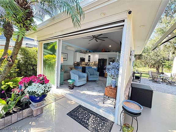Welcome to Lot 49, a sanctuary of luxury and tranquility in one of the finest Class A Motorcoach Resort settings you could imagine. Nestled in the exquisite RiverBend community, you will fall in love with this exceptional lot the perfect blend of elegance, comfort, and serenity. As the first light of day stretches across the sky, the serene beauty of the sunrise paints a stunning backdrop to your morning ritual. Picture yourself stepping onto the lush, walking paths of your private garden oasis, the soft rays of dawn casting a glow on the tropical foliage. With a warm cup of coffee in hand, the gentle sound of your fountain play a soothing soundtrack to the moment. As evening falls, the garden transforms, with strategically placed lights illuminate the walking paths and highlights the lush greenery. The fire-pit area, surrounded by these soft lights, becomes a magical retreat, where the flickering flames and ambient glow create an enchanting atmosphere. As you wander towards the rear of the lot, you are embraced by the shade of majestic palms and live oak trees draped in delicate tufts of moss, evoking the timeless charm of Old Florida. This expansive, private yard is not only a serene escape, but a safe, open space for your furry companions to enjoy. Every inch of this property has been designed for relaxation, seclusion, and beauty. The 16x24 Coach House is a masterpiece in design, offering an airy and welcoming open-concept living space. French doors invite the natural surroundings inside. Bathed in natural light from sliding glass doors, the space is reminiscent of the peacefulness of the ocean, with its soothing palette and thoughtfully curated interior, from crown molding with built-in lighting to the soft, ambient sound provided by discreet built-in speakers. The stylish kitchenette is perfect for entertaining or hosting social hours, the elegant bathroom offers an updated aesthetic with sleek glass wall, fully tiled shower, and a spacious vanity that is luxurious enough for two. A loft space provides storage, and the washer and dryer offer convenience. Including a charming bistro table for two, two loungers, a four-seat dining table, a cantilever umbrella, and a welcoming fire-pit, four cushioned chairs to fire pit, in addition to two outdoor chairs with yellow cushions and loveseat too, all designed for relaxation and entertainment. The garden's carefully chosen tranquil fountain further enhance the outdoor living experience, creating a peaceful retreat at every turn. Most of the thoughtfully selected furnishings, both inside and out, will convey with the property, allowing you to step into a fully realized and welcoming space. Bonus features: You'll also enjoy a top-of-the-line Marantz sound system with speakers throughout, providing a soundtrack to all your favorite moments.