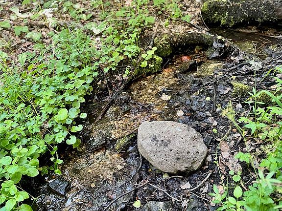 A picturesque stream runs through the property, enhancing its serene ambiance there is also a cleared driveway and a flat area prepared for construction.