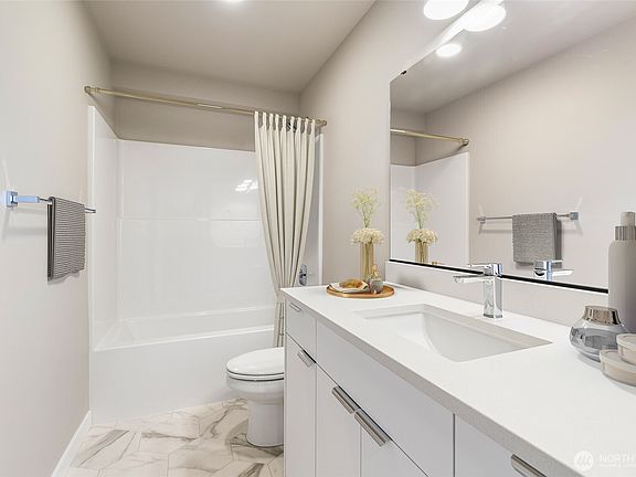 Welcome to Northview 2 in Cordata, Bellingham's premier solar home community! This stunning 2-story contemporary home features an open and spacious floorplan, a custom kitchen with sleek quartz countertops, and a primary suite with a private ensuite boasting a double sink and walk-in closet. Enjoy two additional bedrooms plus a versatile den/office that can serve as a possible fourth bedroom. Built with sustainability in mind, it offers efficient mini-split heat pumps with A/C, a low-maintenance yard, a covered patio, and EV charger prewiring. Take in mountain and golf course views. Includes a 2-car garage. Your dream home awaits—secure yours today!