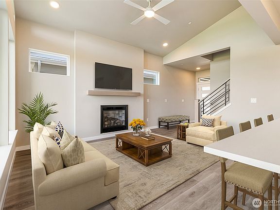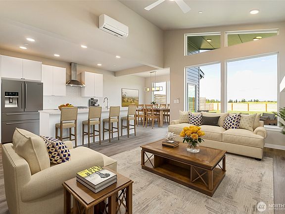 Welcome to Northview 2 in Cordata, Bellingham's premier solar home community! This stunning 3-bedroom, 2-story contemporary home features an open and spacious floorplan, vaulted ceilings, and large windows that fill the space with natural light. Enjoy a custom kitchen with sleek quartz countertops, a primary suite with an ensuite boasting a double sink and walk-in closet, and a main-level bedroom for added convenience. Designed with sustainability in mind, this home includes efficient mini-split heat pumps with A/C, a large covered patio, a gas fireplace, and EV charger prewiring. Take in mountain and golf course views. Includes 2-car garage. Your dream home awaits—secure yours today!