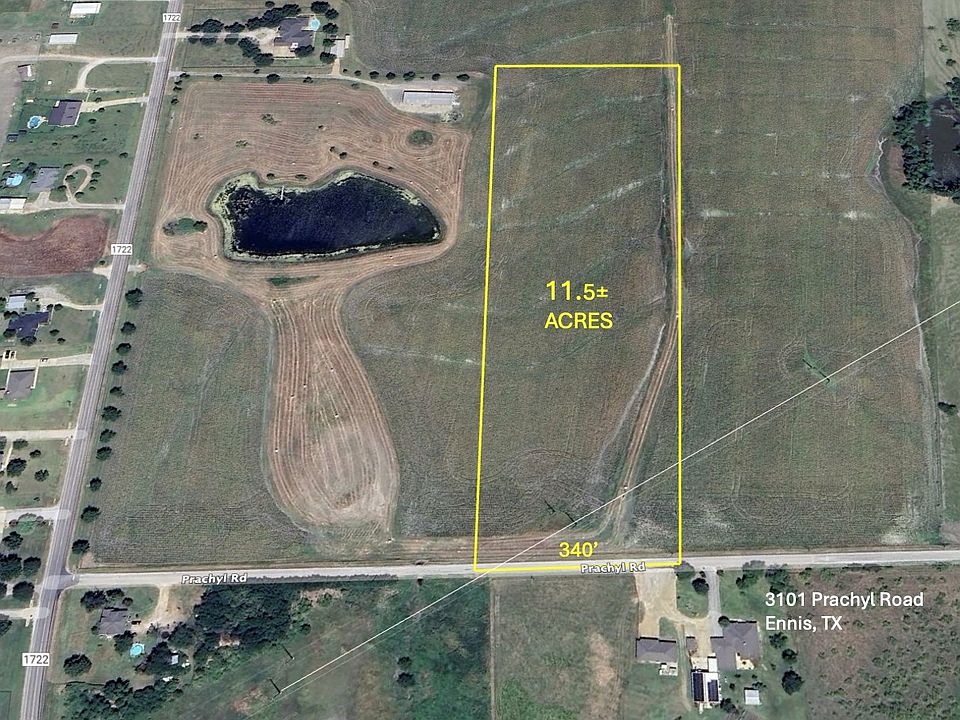 Discover this balanced blend of clean land with easy access to the City. This is a 11.5 acre subdivided tract from an established farm, surrounded by grazing pastures and rural homesteads. There is an Ag exemption in place, no floodplain on-site and there is barbed wire fence across the front of the road and the East boundary. Water and electricity service is available along Prachyl Rd, and a septic system needs to be installed for sewer services. From this property you can reach downtown Ennis in 10 minutes, Waxahachie in 15 minutes and DFW airport in less than an hour.