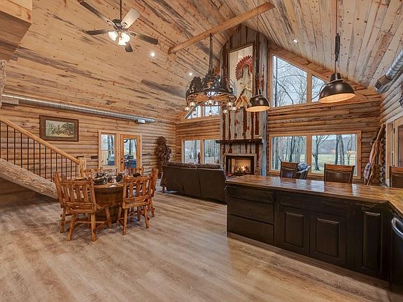 Stone fireplaceSoaring ceilingsRich wood finishesOpen-concept living spaceCustom detailsOutdoor covered patioGlass prow front