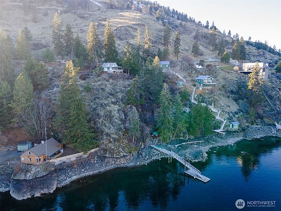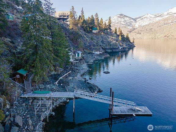 A charming waterfront location, at the secluded Robison's Holiday Point, is located close to 25 Mile Creek. View the sunrise from your covered deck. Take a jointly shared stairway and dock on your 50 feet of waterfront with boat house. Dock has boat lift and steel gangway. This naturalized setting is a stunning viewpoint both up and down lake. Lots of outdoor activities can springboard from this location. Garden rockery, trees, sun deck, or walking on this quiet dead end lane. This is a unique one of a kind location for Lake Chelan. Property is over one half acre and you can build to suit your own dream home. Amazing opportunity to build with no CCRs and close access to boat launch and hiking trails.