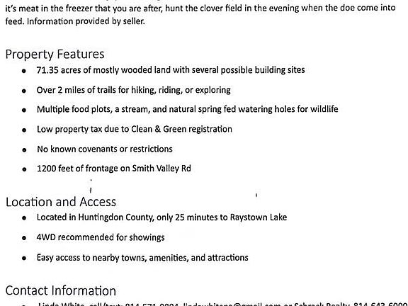 71+ wooded acres for your hunting and recreational pleasure. Numerous ATV trails on property. Low property tax due to Clean & Green registration. Privately-owned land, no known covenants or restrictions. Buyer to verify. Approximately 1200 feet of frontage on Smith Valley Rd. 4WD recommended for showings. Tree stands are not included and will be removed prior to closing.