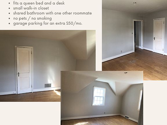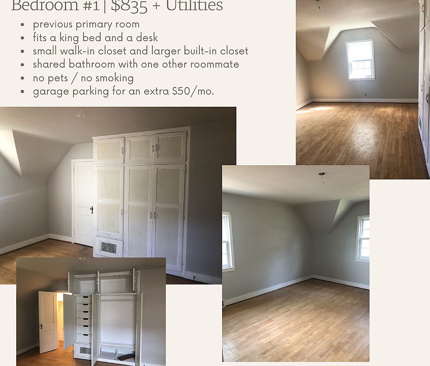 Room #1 ($835): previous primary room, fits a king bed and a desk, small walk-in closet and larger built-in closet