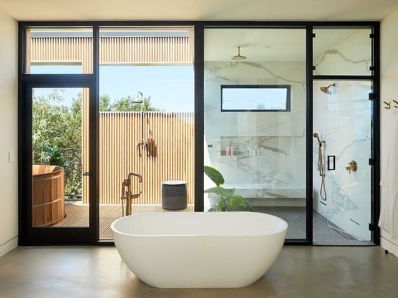 - Exterior features: Heating system: Forced Air, Outdoor chef's kitchen, View Type: panoramic ocean views, Walk In Closet, fire pit, large open grass field, meditation sanctuary, outdoor barrel soaking tub, outdoor shower