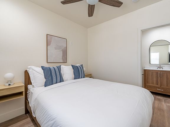 Bedroom #1 (primary): King bed, ensuite bath, nightstands, table lamps, smart tv, armoire, closet, luggage rack, ceiling fan, access to backyard