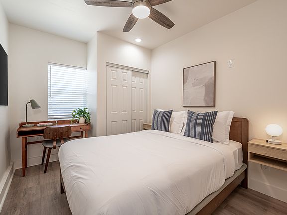Bedroom #3: Queen bed, nightstand, table lamp, ceiling fan, smart tv, closet, luggage rack