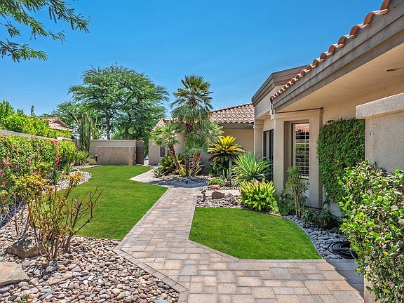 Tucked away on a quiet cul-de-sac overlooking the18th tee box of the coveted Nicklaus Private golf course inside PGA West. A private courtyard has been updated with paver walkways and lush landscape. Outdoor spaces include a private, pebble finish pool with a tanning shelf and spa, multiple seating areas, built-in BBQ, island seating, built-in fire pit and electric awnings for additional shade. This area was designed for relaxation and fun offering golf course and mountain views ,Upon entering the home you are met with a Desert Boho motif featuring new flooring, base boards, paint, soaring ceilings and a glassed-in atrium giving you a sense of bringing the outdoors to indoor living. Living room areas include a wet bar featuring refrigerator, ice maker and wine refrigerator. The fully stocked kitchen hosts new countertops, plenty of prep areas, new cabinetry, plenty of storage and open outdoor views .The spacious primary suite has an attached private bath with a free-standing soak tub, new lighting, double vanity, new cabinetry and a large walk-in closet. Guest bedrooms are generous in size and each have their own private en-suite baths with ample closet space. This home comes with a multi-room sound system connecting through bluetooth for music throughout the home, is fully furnished and finely appointed. Two car attached garage with additional space for golf cart, ample additional parking for guests Everything is ready and waiting for you to come and enjoy. Longer term lease is available. This home is a single-story end unit condo w one common wall.