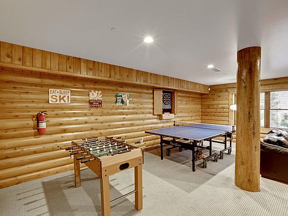 Large downstairs entertainment/TV room with ping pong, darts, foosball, board games, and books (plus Pop-A-Shot in garage)