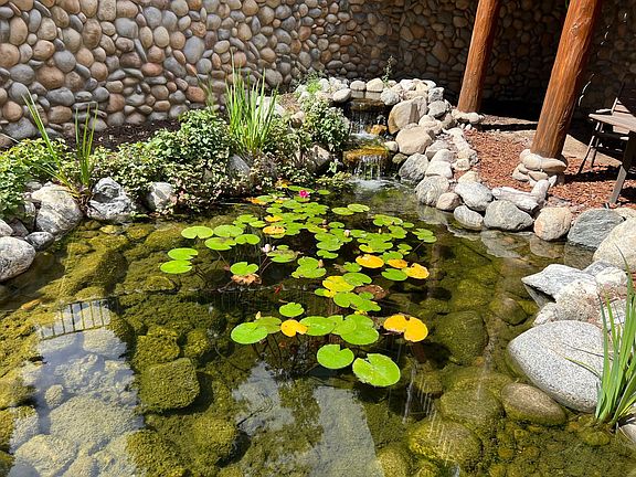 Master bedroom with king bed, large bathroom (with jacuzzi) and adjacent deck overlooking a flowing, lighted stream