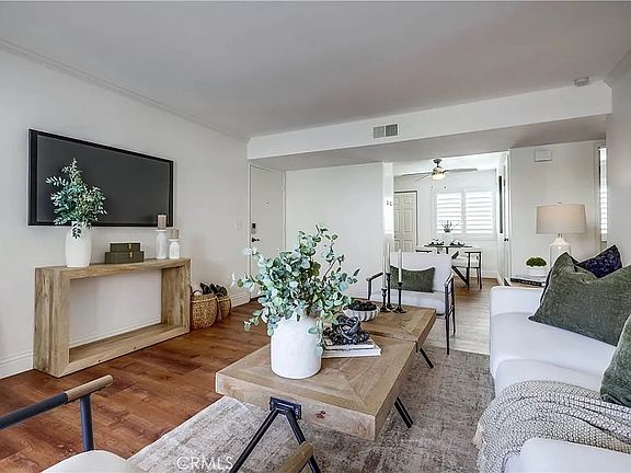 Beautifully updated and improved lower-level end unit in the desirable Serrano Creek Villas community, blessed with a peaceful and private location tucked back in the community surrounded by green spaces providing a peaceful living environment. Step inside and soak in the light and bright, freshly painted interior with new commercial grade scratch resistant Trail Oak Luxury Vinyl Wide Plank flooring throughout, crown molding, and plantation shutters setting the stage for an ideal living space. The spacious living room has direct access through sliders to the covered patio providing an ideal indoor-outdoor living space. The sparkling kitchen has updated soft close cabinetry, Quartz countertops, new hardware and pulls, undermount sink, subway tile full backsplash, stainless-steel appliances, a large walk-in pantry with plenty of storage, a laundry closet with full size washer and dryer, and a sunny dining area open to the living room, perfect for entertaining friends and family. Two spacious bedrooms with closet organizers, crown molding, plantation shutters, and a handsome upgraded bathroom with granite topped vanity, framed vanity mirror, updated lighting, and tiled shower surround with glass tile details. The covered, enclosed, private patio is a welcoming space for enjoying a morning cup of coffee with a loved one, al fresco dining, or relaxing and gatherings. Additional improvements include a New AC unit installed in 2023. Just a short stroll to the community clubhouse, pool, and spa. 1 covered carport space #253 included. Serrano Creek Villas is a quiet and friendly community with serene walking paths, an abundance of parking, surrounded by lush mature landscapes. Rent covers Water & Trash. Ideally located within walking distance of hiking, biking, and running trails, close to dining and shopping, easy Toll Road and 5 Freeway access, and just minutes from local beaches.