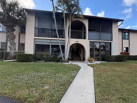 Beautiful corner unit on the ground floor located in the desirable Pine Ridge South IV community in Greenacres. This 2 Bedroom, 2 bath condo offers 922 sq ft of comfortable living space with a bright layout and a spacious living/dining area, an eclosed Florida room, large bedrooms, and plenty of storage. The building is well-maintained and surrounded by lush landscaping, offering a quiet and relaxing enviroment. Screened patio has morning sun exposure & includes a storage closet. The kitchen is updated with newer cabinetry, countertops, undermounted sink, accent lighting& stainless steel appliances, Walk in pantry has plnety of storage & has full size washer/dryer included. All assessments are paid with new roof installed in 2024. This 55+ community provides excellent amenities including a clubhouse, pool, walking paths, shuffleboard, and social activities, Low HOA of 1653 every 3 months, which includes building insurance, exterior maintenance, cable, and common areas. Rentals allowed after the First Year. Centrally located near shops, restaurants, parks, medical centers, and just minutes from major highways. FHA/VA loans are approved/accepted