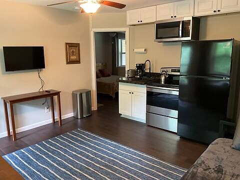 Elegantly decorated condominium style home and featuring hardwood floors, granite countertops, central air/heat, full kitchen (i.e. toaster, kettle, coffee maker, microwave, stove/range, refrigerator), full bathroom and LED HD Smart Fire TV with own internet access and streaming including Netflix, Apple TV, Prime Video, Disney +, Hulu, etc.