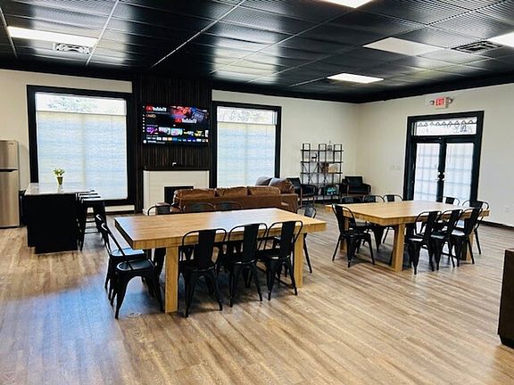 Large back deckLarge tablesBig screen tvsDart boardAir hockeyMultiple seating areasDecorative ceiling tile