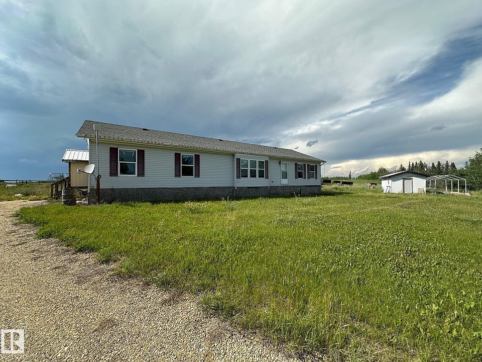 Great location on this 15.87 acre property. Inside the modular home there are 3 bedrooms, 2 full bathrooms. Big entry with lots of room for storage, laundry, 4 piece main bathroom, 2 bedrooms on this side of the house. The main living area is huge with a massive living room, dining room and kitchen with lots of cabinets, large island, sink under the window looking out back. The primary suite is large with lots of bright windows. The ensuite features a big tub, separate shower and plenty of counter space and storage. There are numerous out buildings and potential for horses. Easy commute to hiway 21, Sherwood Park, Beaumont and south Edmonton.