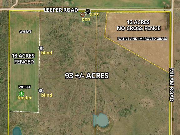 This 93 acre tract is a good combination of hunting and ranching. With a mix of cover and improved pasture. This fantastic piece of land also has a 14 acre Wheatfield, two ponds, views for miles and miles in three directions. Offering a versatile blend of native pasture, improved grasses, cultivated acreage, and two ponds, making it ideal for recreational use, livestock, or future homesite development. Located at the intersection of Leeper and Milam Roads, this property has rural appeal with practical access to utilities and water resources. Good cattle pens and fencing.