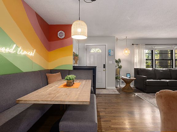 There are 4 steps up to the front porch, and the rest of this beautifully designed home is all on one level. You will enjoy the convenience of the included laundry and two bathrooms. The fully equipped kitchen has everything you need to prepare delicious meals during your stay and the dining area provides comfortable seating for six or more. Vintage decor and fun wall murals create a unique, warm and inviting space for families and friends to enjoy each other's company.