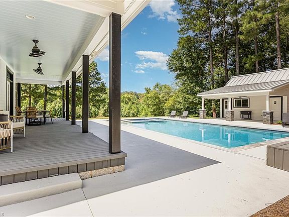 Experience resort-style living in this modern 3-bedroom, 2-bath farmhouse estate on over 17 acres of private land in Lexington. Nearly every detail has been updated to blend luxury with timeless style. The open-concept layout showcases soaring ceilings, abundant natural light, and a kitchen with modern appliances, sleek cabinetry, and a spacious island for entertaining. Built-in speakers throughout the house, barn, and pool house enhance daily living. The backyard features a heated saltwater gunite pool with built-in hot tub and expansive patios, while the pool house provides additional living and entertainment space with its own covered porch. Highlights include a spacious front porch, multiple outdoor areas, a versatile barn/garage, a detached covered carport, a long private drive with ample parking, and a wooded backdrop offering privacy and tranquility. Conveniently close to Lexington’s amenities, this estate unites sophistication and comfort, creating a private sanctuary.